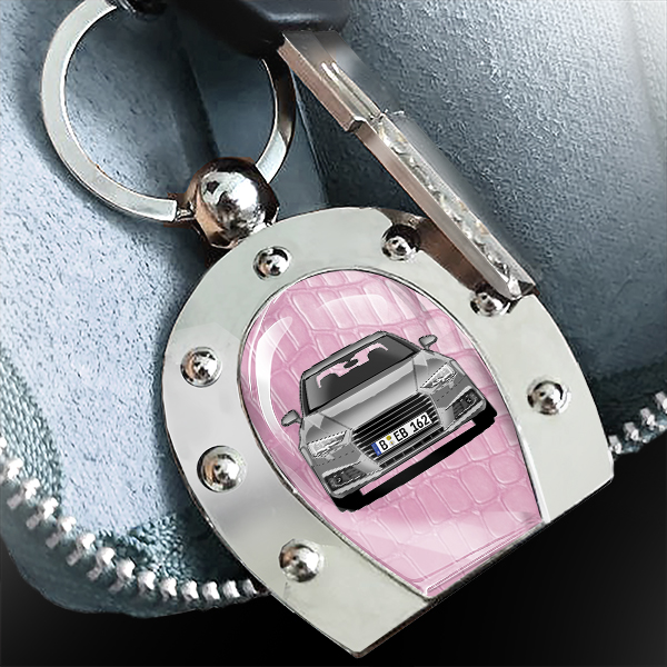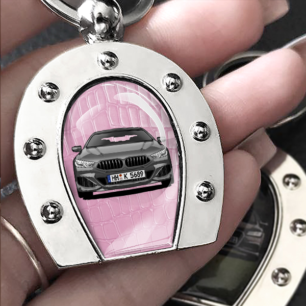 Individueller Hufeisen Schlüsselanhänger Chrom-M mit deinem Auto u. Kennzeichen mit Rosa Schlangenleder Hintergrund!
