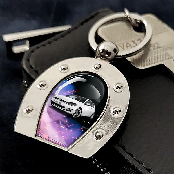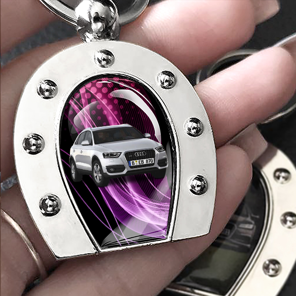 Individueller Hufeisen Schlüsselanhänger Chrom-XL mit deinem Auto u. Kennzeichen mit Lila-blauer Staub Hintergrund!