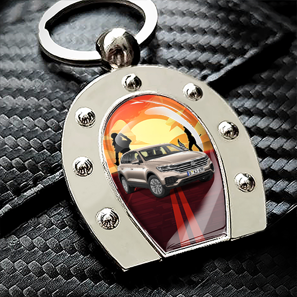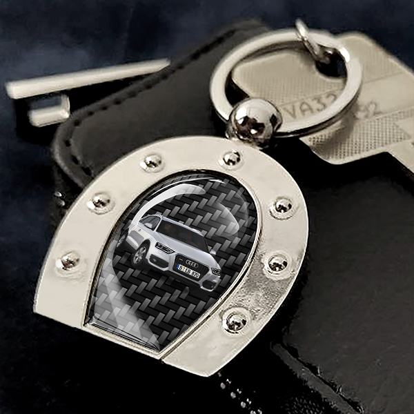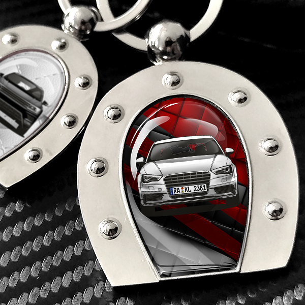 Individueller Hufeisen Schlüsselanhänger Chrom-XL mit deinem Auto u. Kennzeichen mit Carbon Hintergrund!