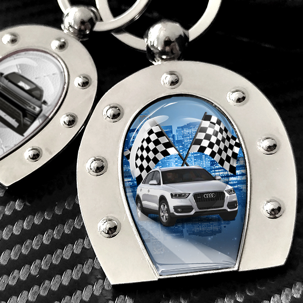Individueller Hufeisen Schlüsselanhänger Chrom-XL mit deinem Auto u. Kennzeichen mit Stadt mit Flaggen Hintergrund!