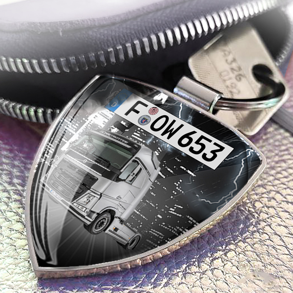 Individueller Schlüsselanhänger-Schild mit deinem LKW u. Kennzeichen in dark-city Design, M, chrom