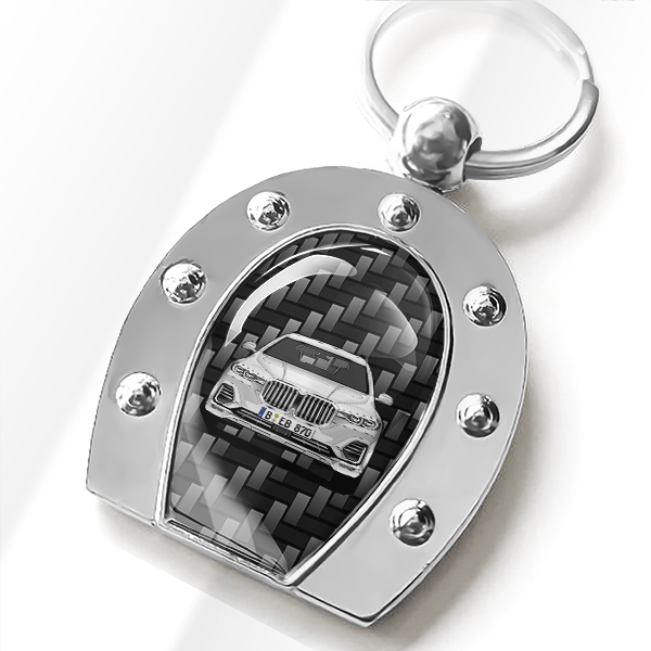 Individueller Hufeisen Schlüsselanhänger Chrom-M mit deinem Auto u. Kennzeichen mit Carbon Hintergrund!