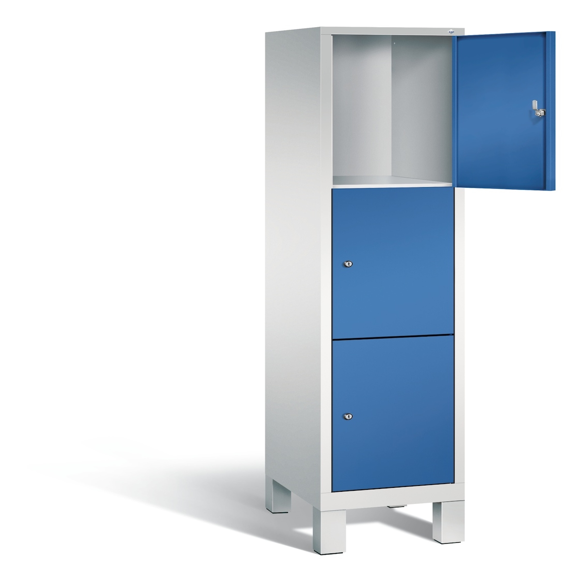 C+P Schließfachschrank Classic PLUS, Füße, 3 Abteile, 1950x900x500mm, 7035/5010 Innenhöhe Gefach oben (oberes 453 mm Front RAL 5010 Enzianblau ; C + P