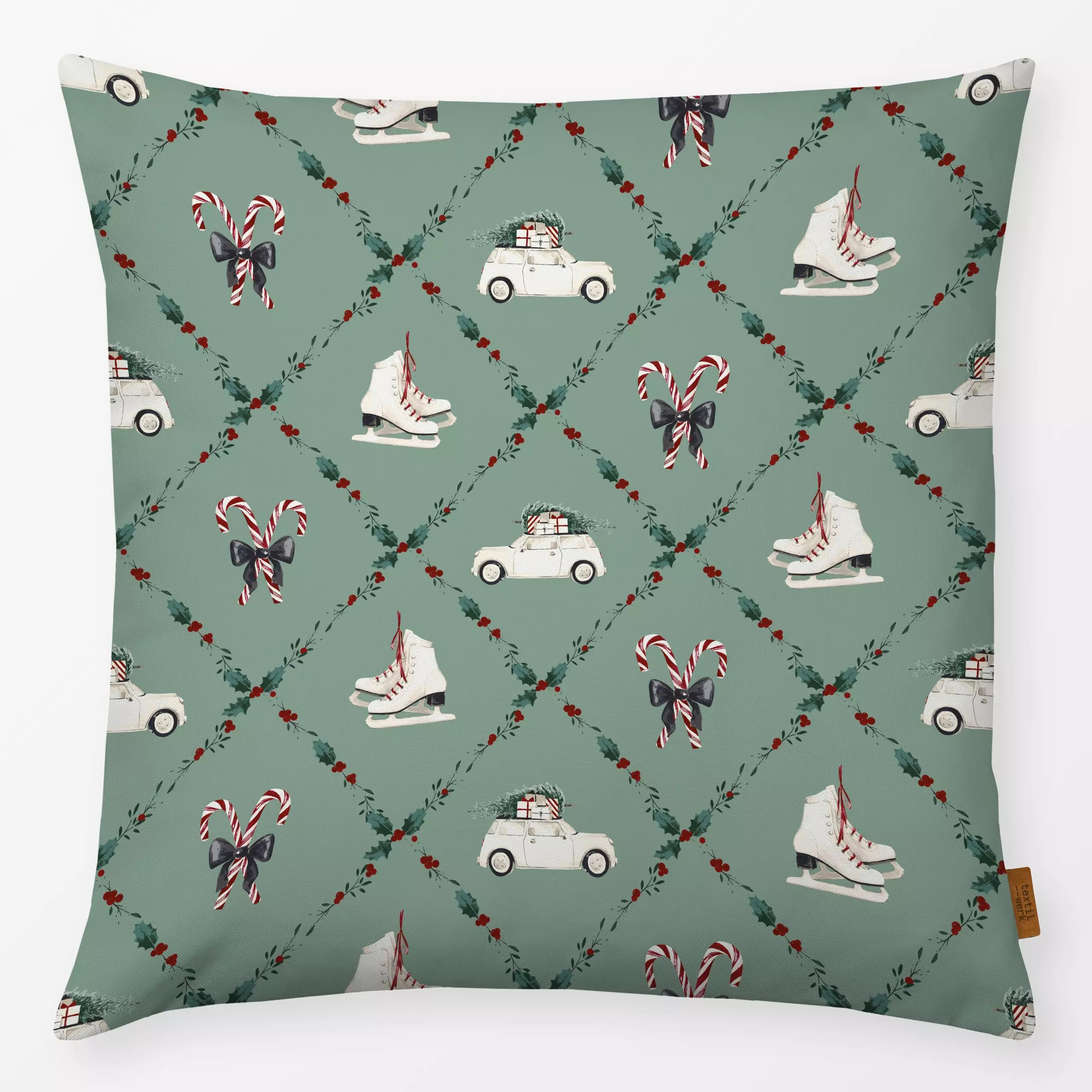 Kissen Joys of Christmas grün - Weihnachten, Winter, Anlässe - von „Katrin Graff"; Schlittschuh, Weihnachten, Auto, Zuckerst...