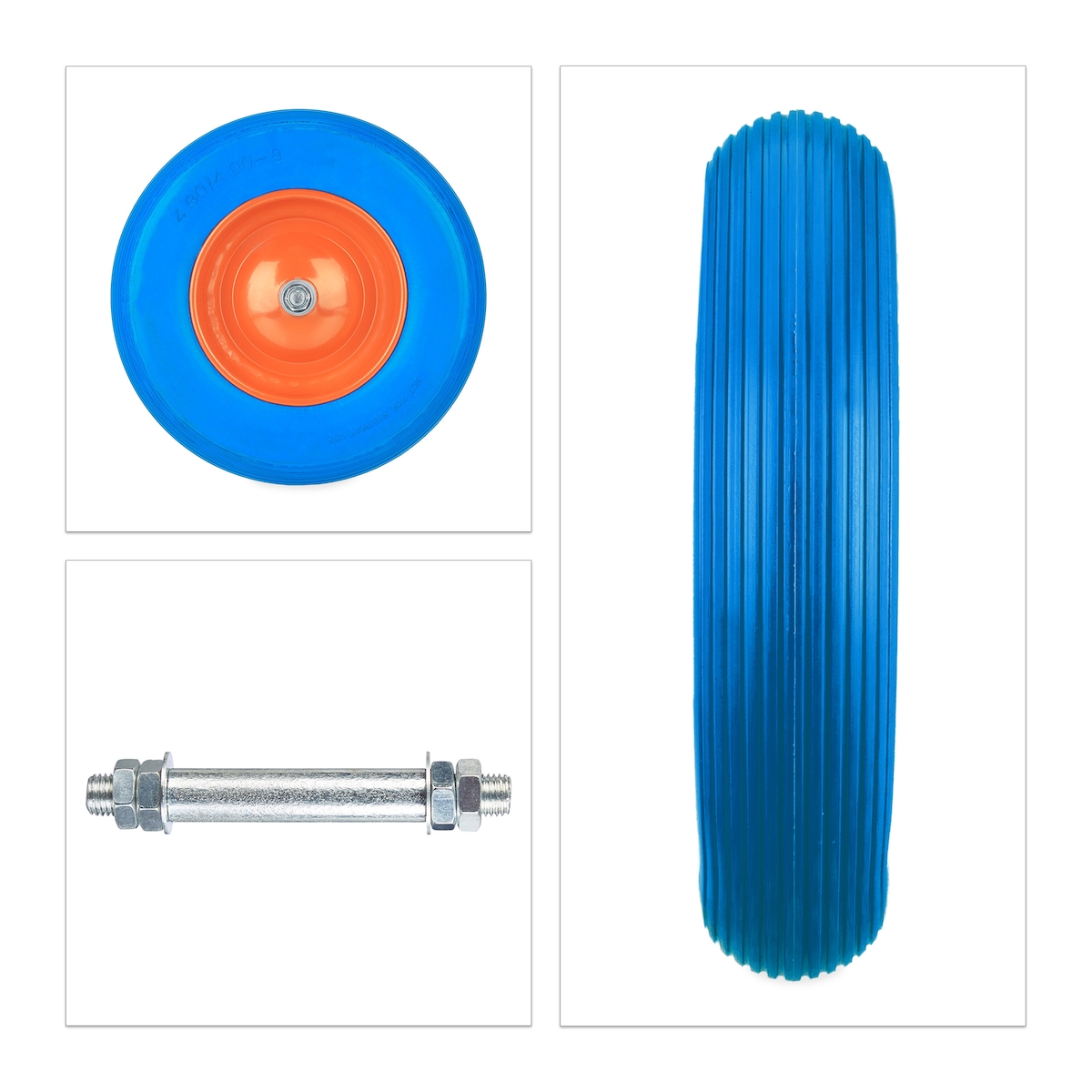 Relaxdays Schubkarrenrad 4.80 4.00-8, Vollgummi, Stahlfelge, mit Achse, Ersatzrad Schubkarre, pannensicher, blau/orange