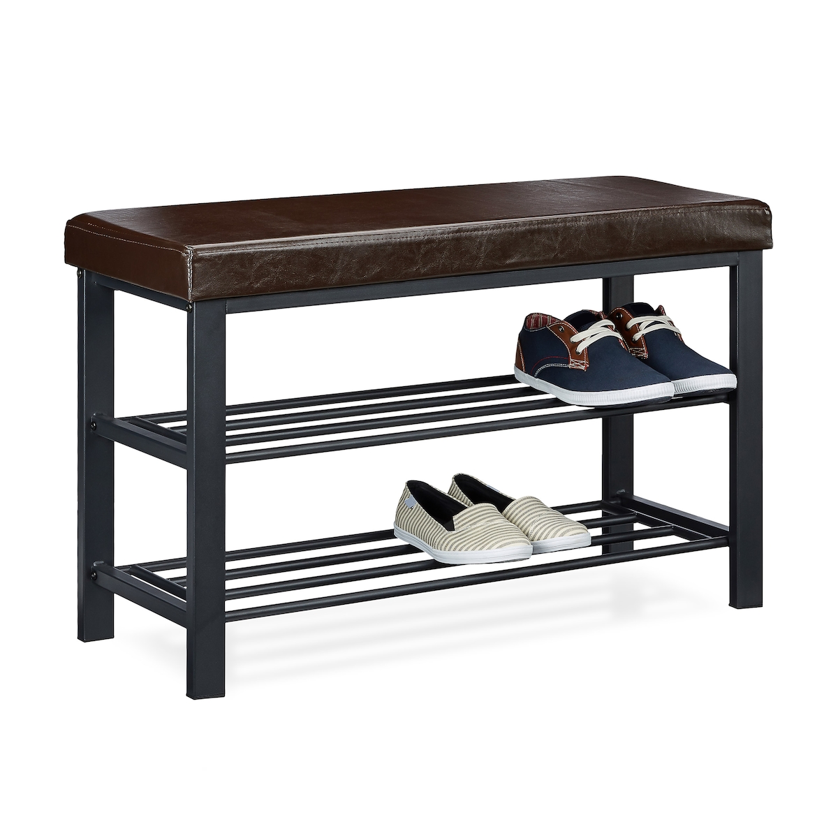 Relaxdays Schuhbank, gepolsterte Kunstleder-Sitzfläche, 2 Schuhablagen für 8 Paar, Schuhregal HBT 50x100x30 cm, braun