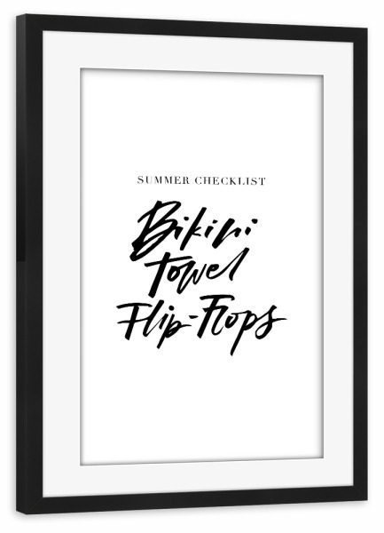 Poster mit Rahmen schwarz "Summer Checklist Bikini Flip-Flops" artboxONE - Typografie,Reise,Schwarzweiß,Reise / Strand und Meer