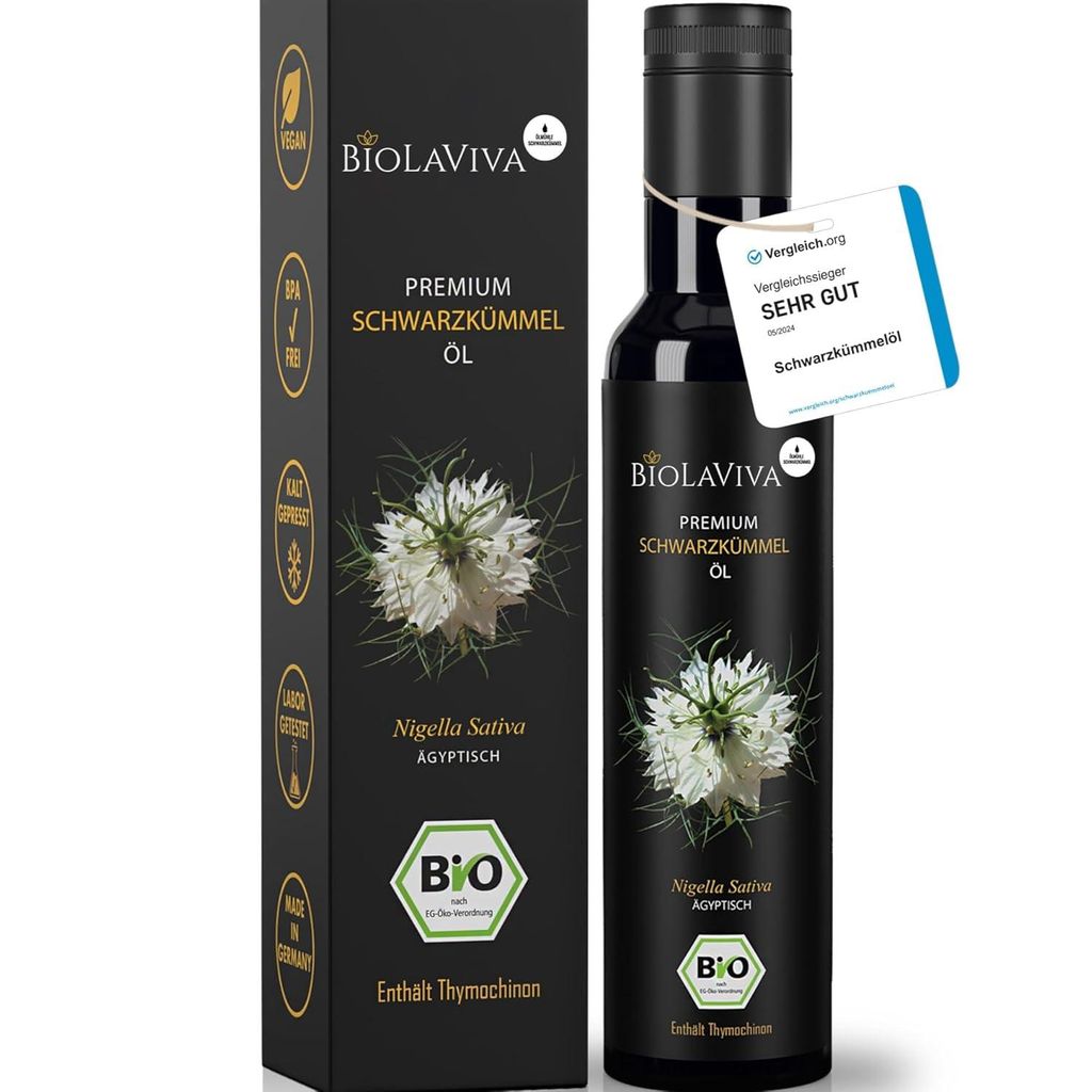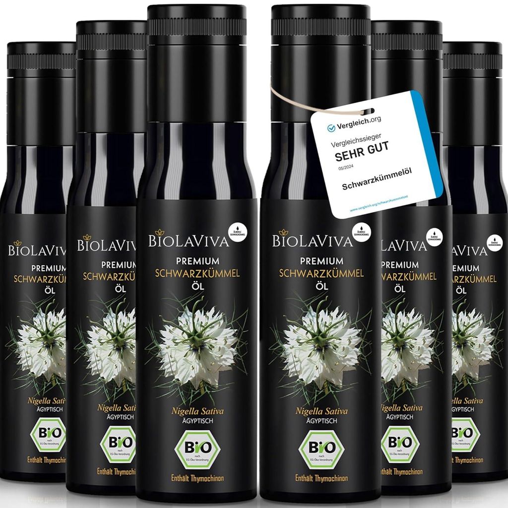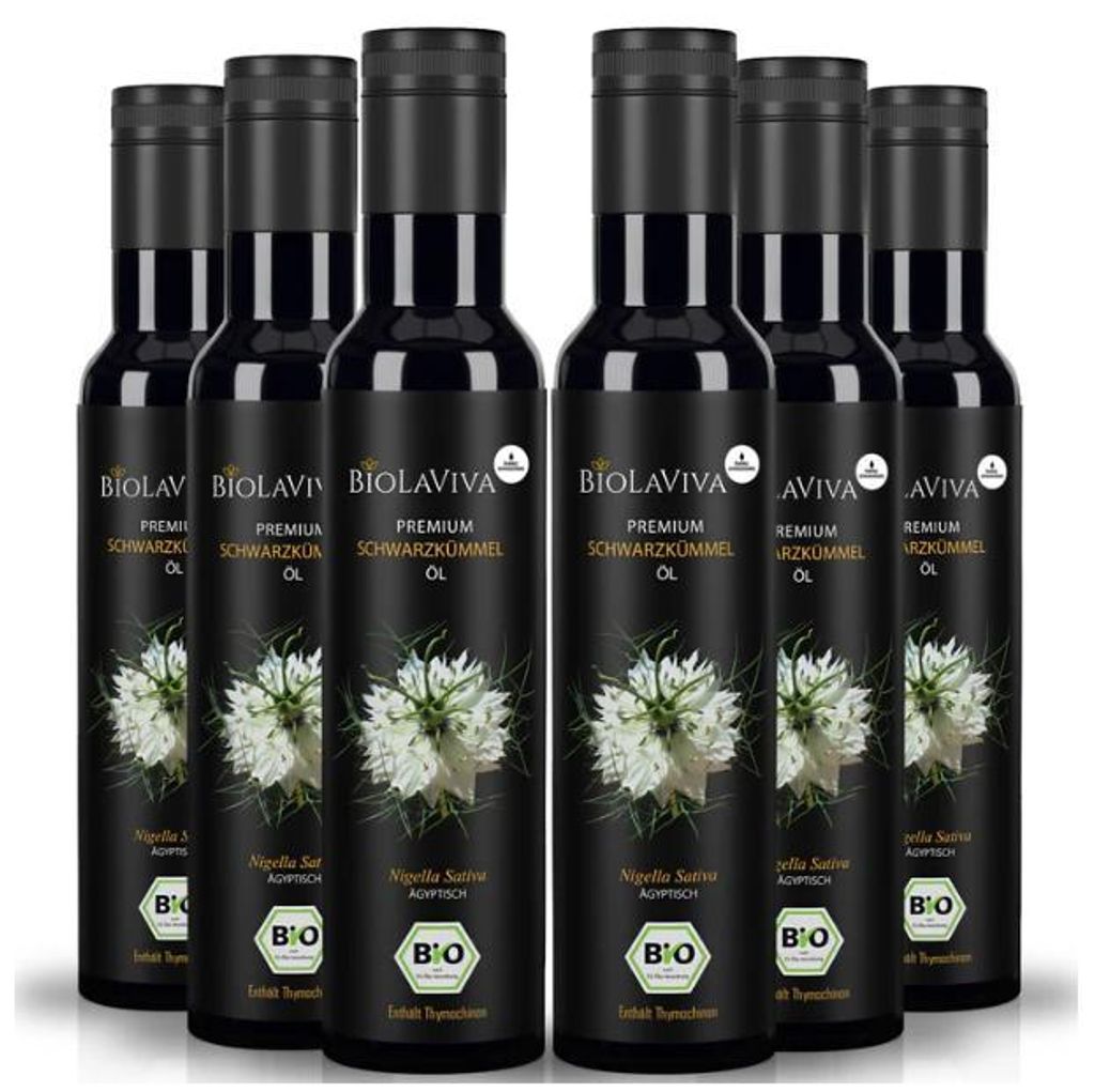 BIOLAVIVA Schwarzkümmelöl (6 x 250ml) – kaltgepresst & ungefiltert – hoher Thymochinongehalt – labor & lichtgeschützt