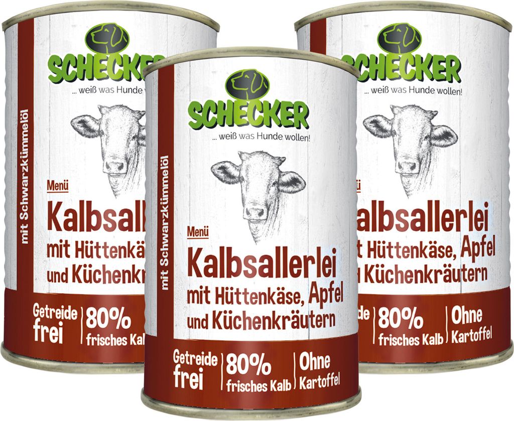 3 x 410 g - Schecker Hundemenü mit 80% Kalb mit Hüttenkäse, Apfel mit Schwarzkümmelöl - Nassfutter