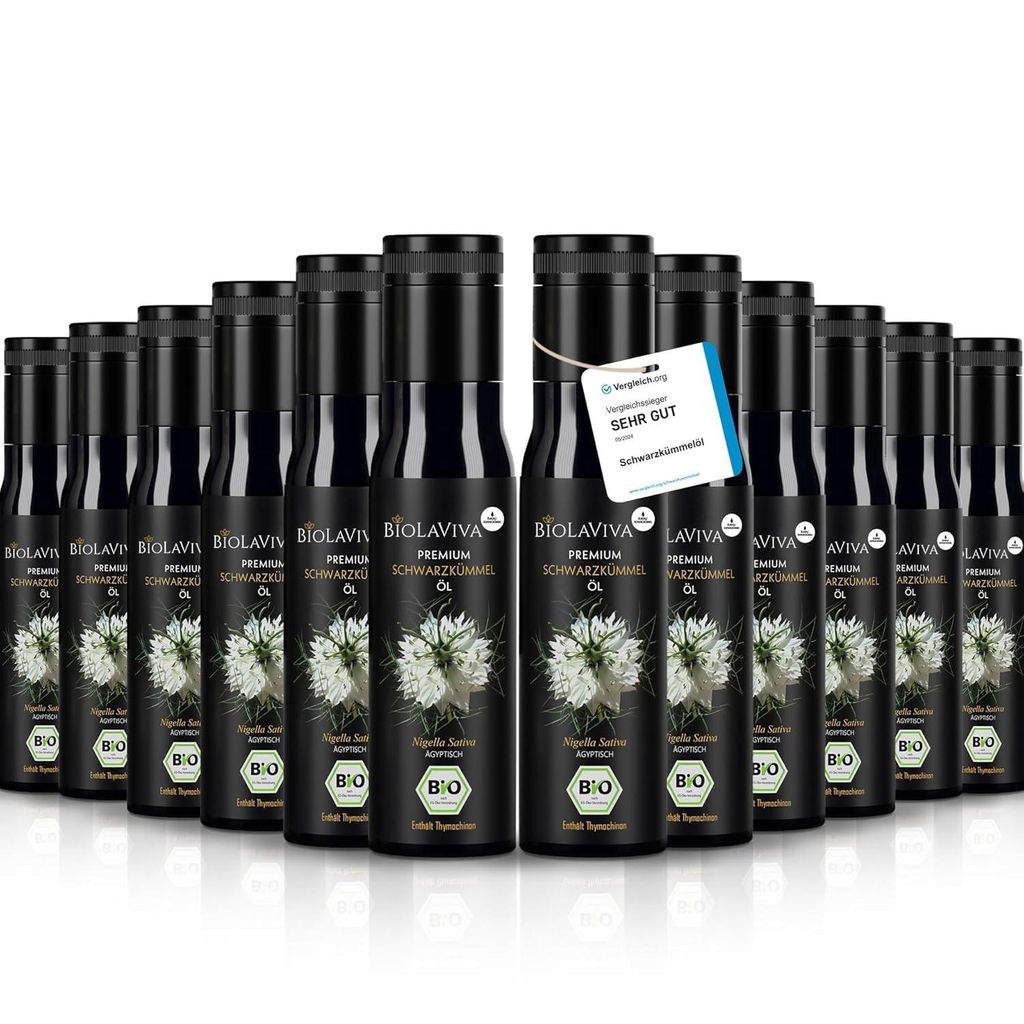 BIOLAVIVA Schwarzkümmelöl (12 x 100ml) – kaltgepresst & ungefiltert – hoher Thymochinongehalt – labor & lichtgeschützt