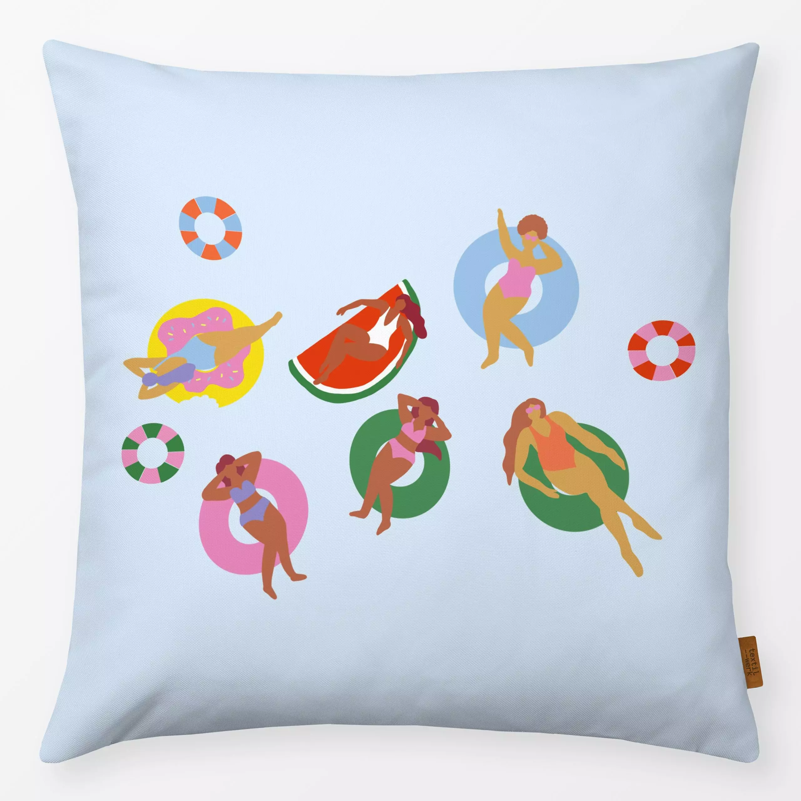 Kissen Schwimmreifen 5 - Sommer - von „textilwerk"; Illustration, skandinavisch, Sommer, Urlaub, bunt, minimalistisch, schli...