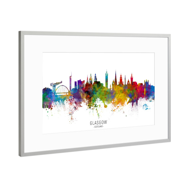 Poster mit Rahmen Silber "Glasgow Scotland Skyline txt" artboxONE - Städte - Glasgow,Scotland,Skyline,Cityscape,Stadtbild,Watercolor,Painting