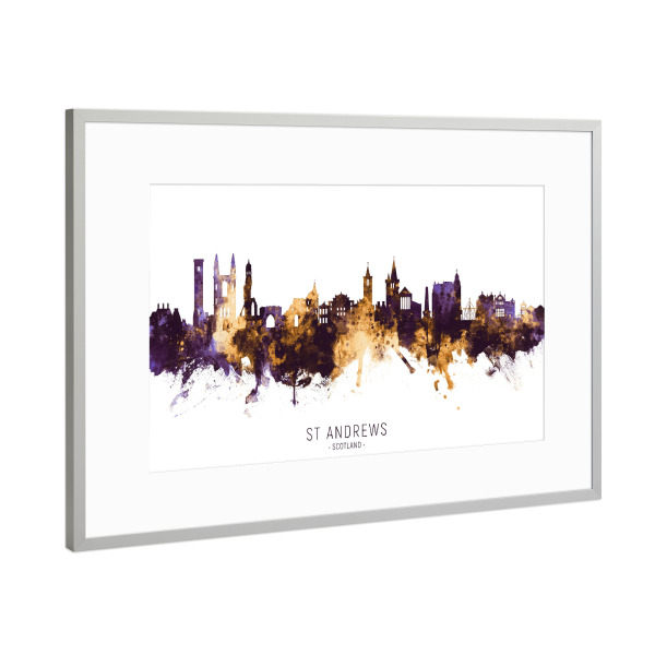 Poster mit Rahmen Silber "St Andrews Skyline PurpleGold" artboxONE - Städte - St andrews,Scotland,Skyline,Cityscape,Stadtbild,Watercolor,City