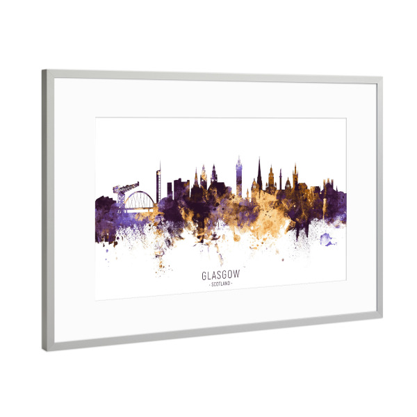 Poster mit Rahmen Silber "Glasgow Skyline PurpleGold" artboxONE - Städte - Glasgow,Scotland,Skyline,Cityscape,Stadtbild,Watercolor,Painting