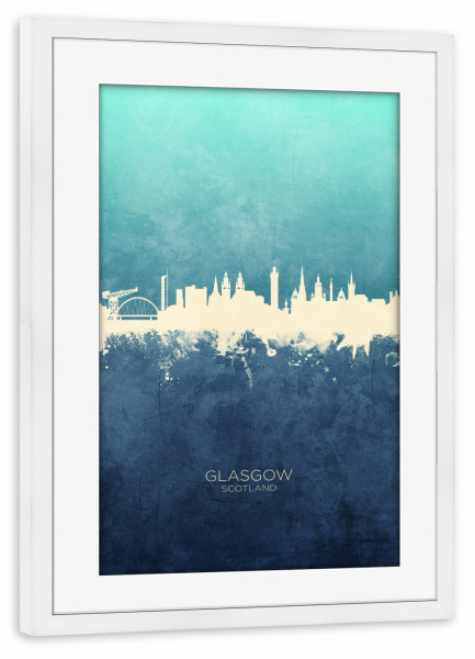 Poster mit Rahmen weiß "Glasgow Scotland Skyline NavyCyan" artboxONE - Städte