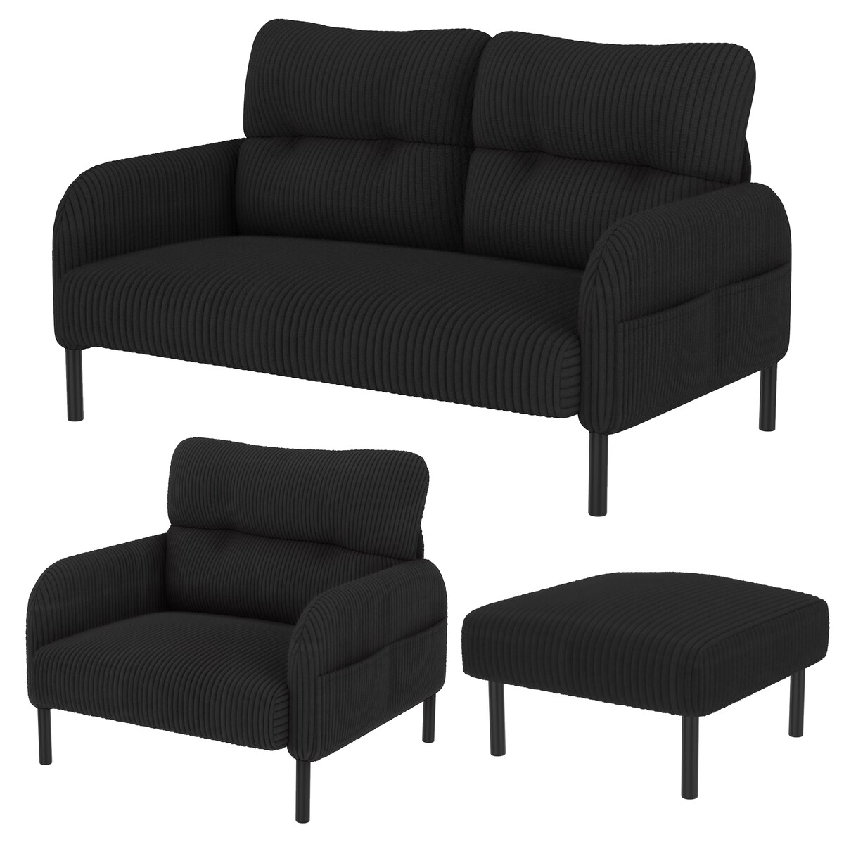 Merax Modulares 3er-Set Cord-Sofa: Sessel, 2-Sitzer & Hocker mit Tasche, Schwarz