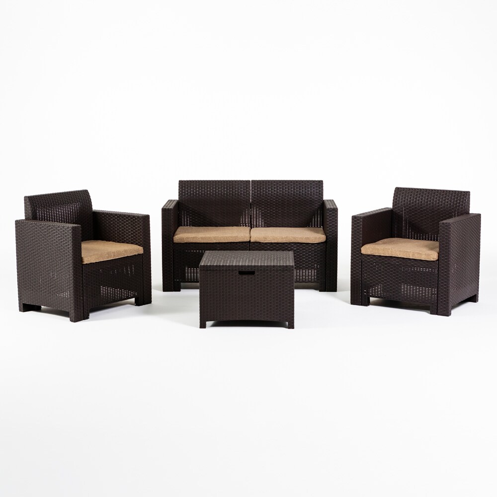 RATTATAN Gartenlounge SALINA aus Polyrattan mit abnehmbaren Kissen, bestehend aus einem 2-Sitzer-Sofa, zwei Sesseln und einem Aufbewahrungstisch –