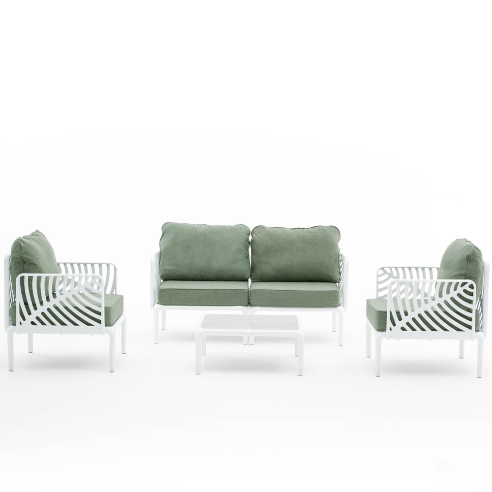 RATTATAN Gartenlounge für 4 Personen aus Polypropylen, bestehend aus Sofa, 2 Sesseln und Couchtisch mit Kissen, modernes Design – Kenzia – Weiß/