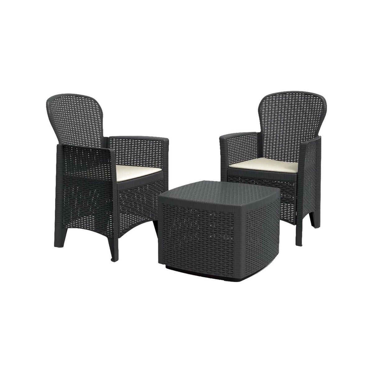 Trinacria - Gartenlounge aus Polyrattan mit 2 Sesseln und Beistelltisch. Anthrazitfarbenes Outdoor-Lounge-Set, geliefert mit 2 cremefarbenen Kissen