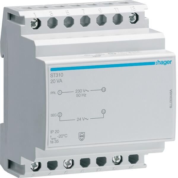 Hager ST310, Sicherheitstrafo, 230V/24V, 20VA, 4PLE