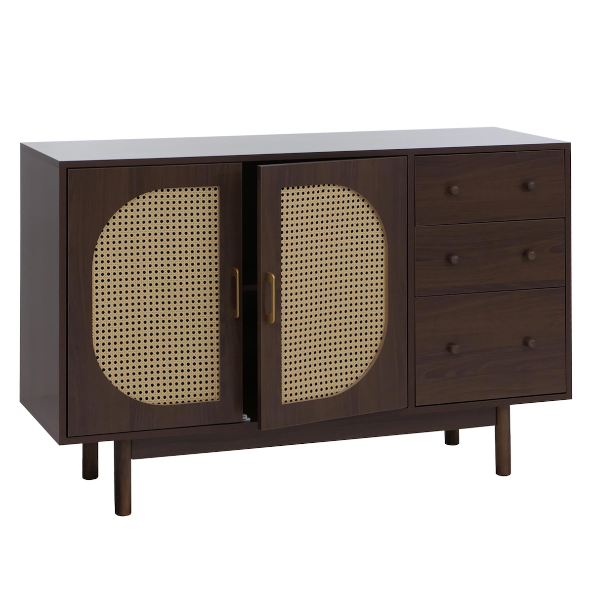 okwish Kommode 120 x 40 x 78 cm, Sideboard mit 3 Schubladen und 3 Schiebetüren, Rattan-Türpaneele, Beine aus Massivholz, Aufbewahrungsschrank mit...
