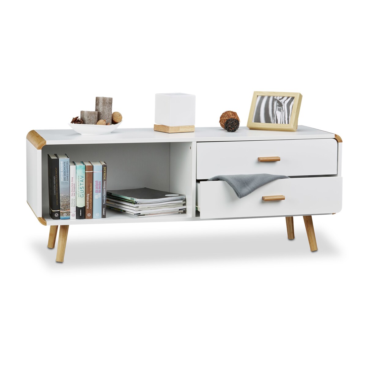 Relaxdays Sideboard abgerundet mit 2 Schubladen, langes Lowboard mit Beine, flache TV-Bank HxBxT 48 x 120 x 40 cm, weiß