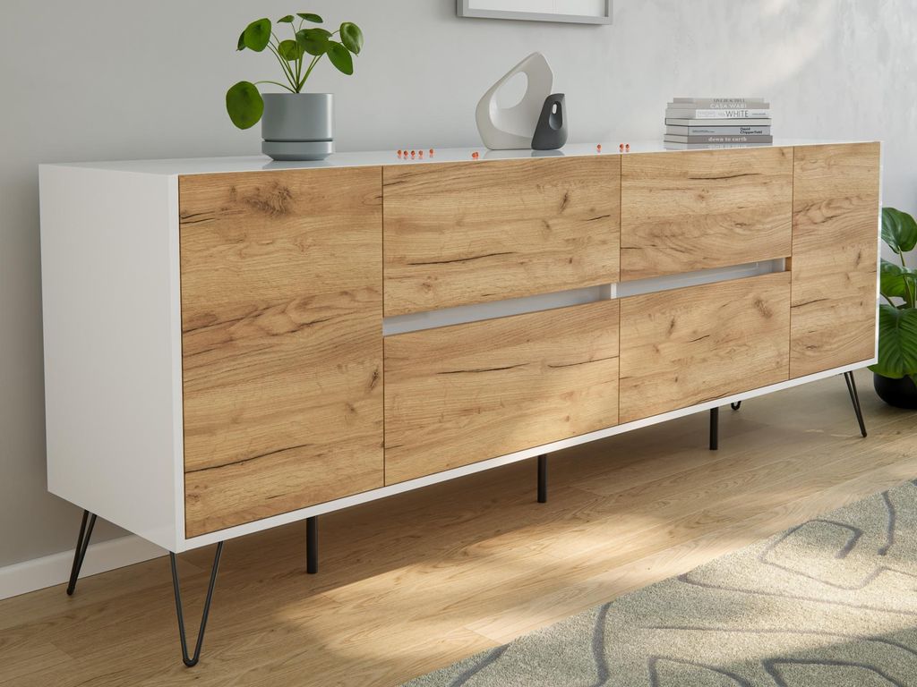 Sideboard Impulse 200cm 3 Türen 4 Pushauszüg Weiß Hgl Eiche : Weiss hochglanz / Eiche Gold Varianten: Weiss hochglanz / Eiche Gold