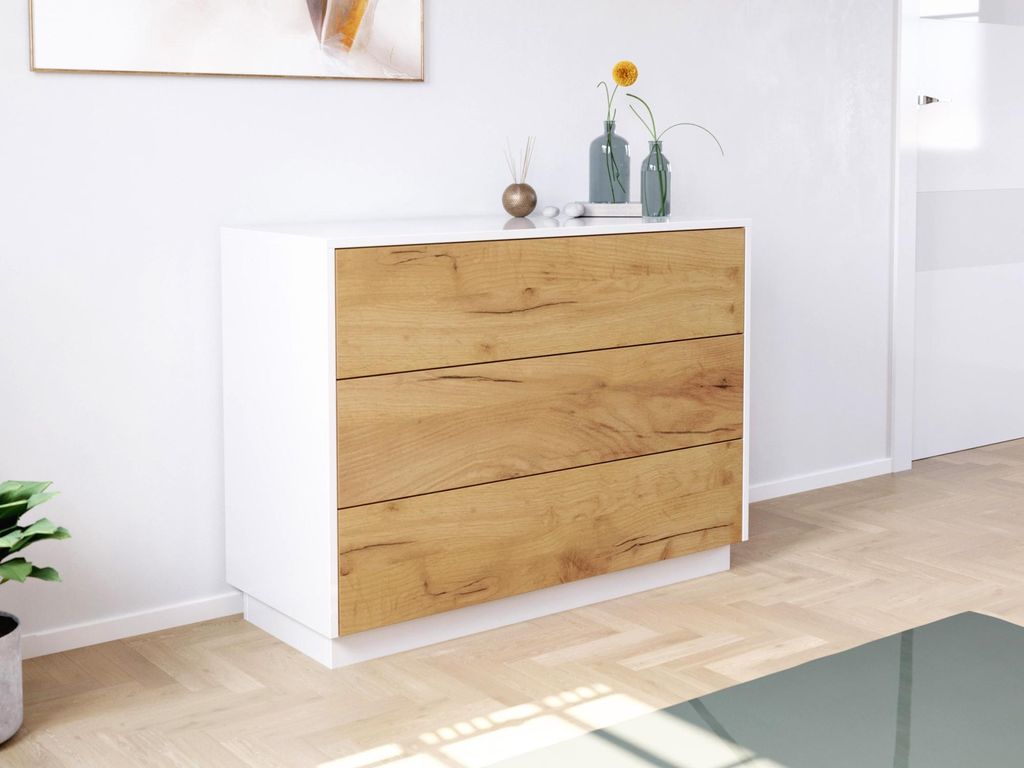 Sideboard Kommode Hero B stehend 100cm 3 Pushauszüge Weiß Hgl Eiche : Weiss hochglanz / Eiche Gold Varianten: Weiss hochglanz / Eiche Gold