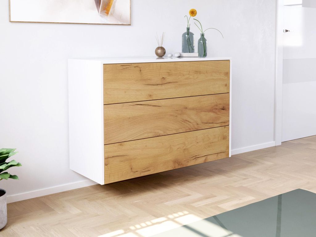 Sideboard Kommode Hero B hängend 100cm 3 Pushauszüge Weiß Hgl Eiche : Weiss hochglanz / Eiche Gold Varianten: Weiss hochglanz / Eiche Gold