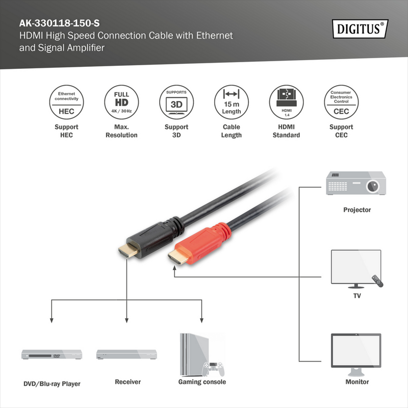 Digitus HDMI High Speed Anschlusskabel mit Ethernet und Signalverstärker Kabel