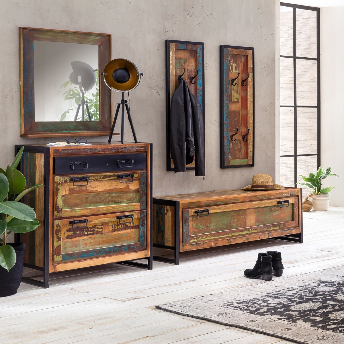 SIT Möbel Dielen-Set 5-tlg., 2 Schuhschränke, 2 Paneele, 1 Spiegel, Altholz bunt, Altmetall schwarz, B98 x T40 x H96cm Serie BALI