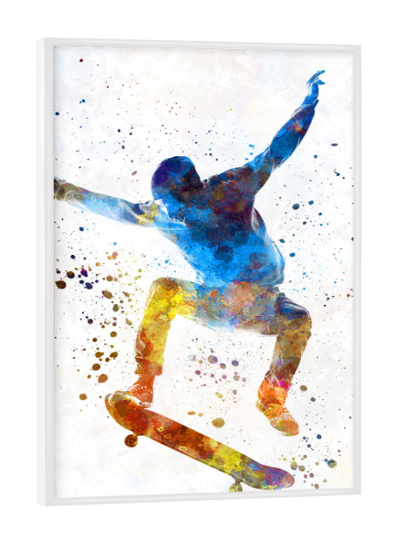 Poster mit weißem Rahmen "Man skateboard in watercolor" artboxONE - Sport - Man,Skateboard,Jump,Skate,Young,Color,Multicolor,Sport,Sports,Watercolor