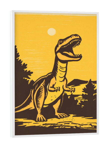 Poster mit weißem Rahmen "Retro-Dino" artboxONE - Tiere,Comic - Kunst,Hell,Dino,Dinosaurier,Glücklich,Minimal,Malerei,Retro,Einfach,Sonne,Trex,Gelb