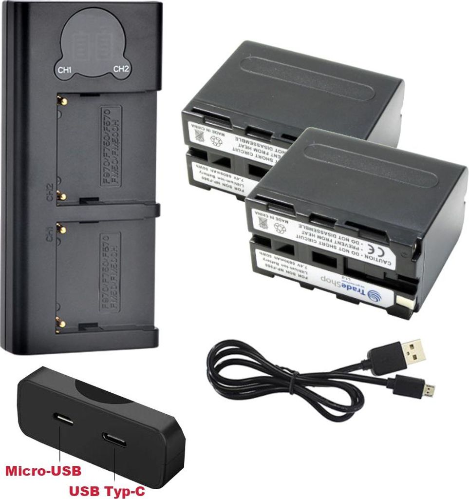 Trade-Shop 3in1 Set: 2x Akku 2000mAh + Micro-USB Typ-C Doppel Dual LCD Schnellladegerät für Sony NP-FM500 NP-FM500H NP-FM55H CS-FM55H CS-FM500H