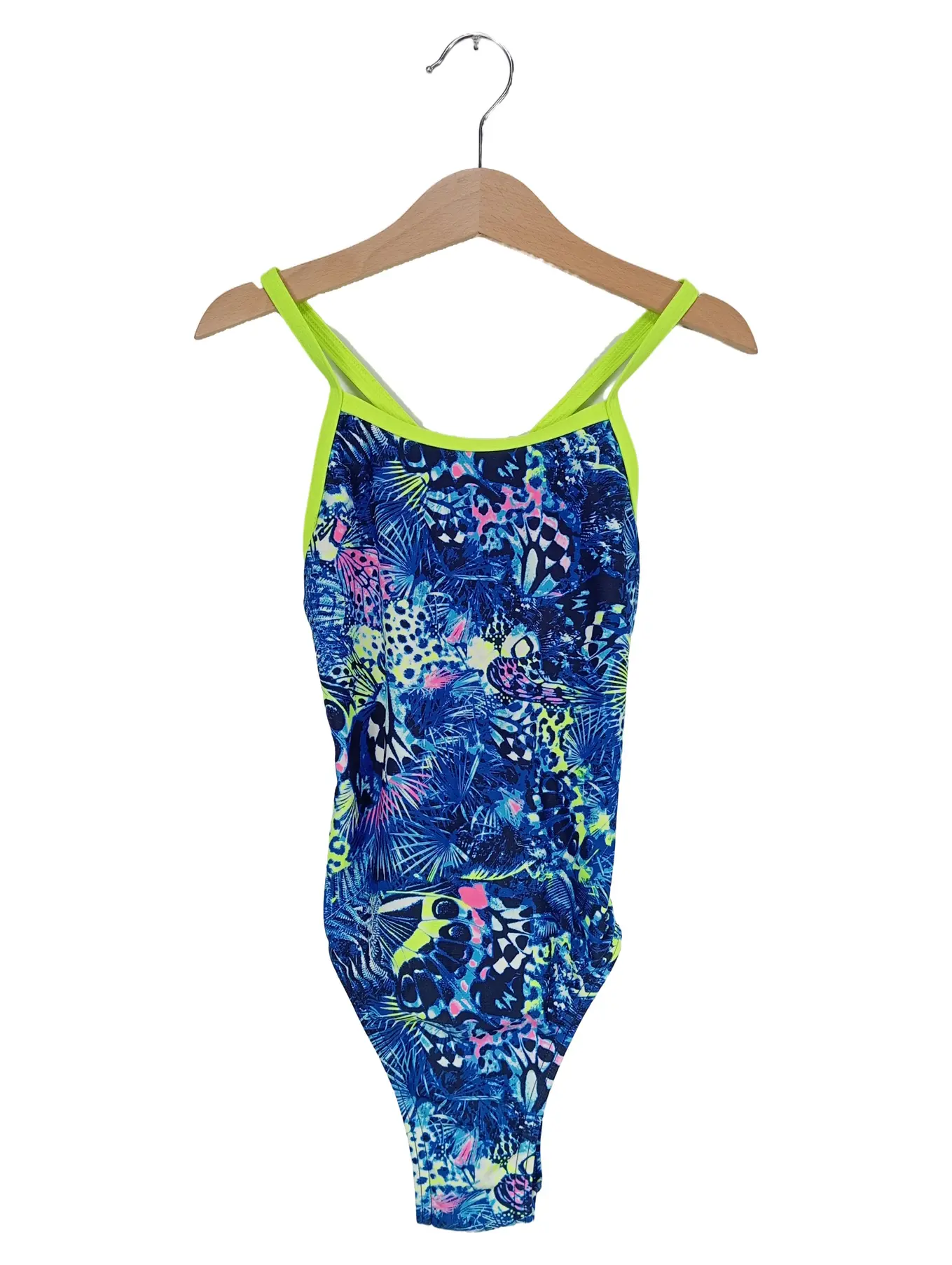 Aquarti Mädchen Badeanzug mit Spaghettiträgern Streifen – Sport Badeanzug Mädchen, Chlorresistent, Farbe: Schmetterling Blau / Schwarz, Größ...