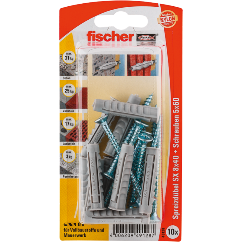 fischer Spreizdübel SX 8x40 S K Dübel, hellgrau, 10 Stück, mit Schraube