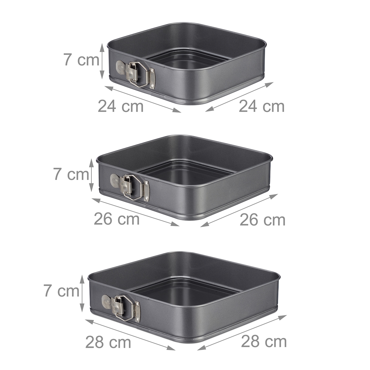 Relaxdays Springform Set, 7-teilig, rund & quadratisch, 18-28 cm, Stahl, Antihaftbeschichtung, Backformen, anthrazit