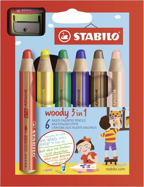 Buntstift, Wasserfarbe & Wachsmalkreide - STABILO woody 3 in 1 - 6er Pack mit Spitzer - mit 6 verschiedenen Farben