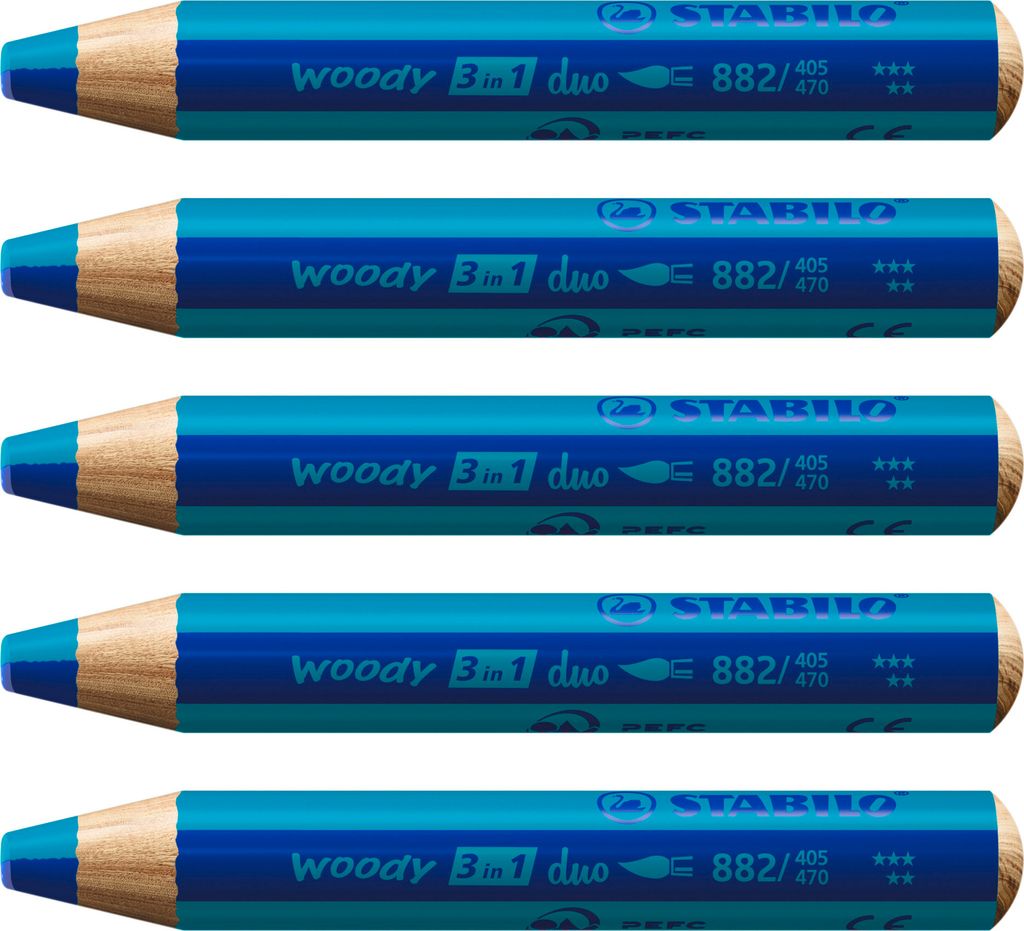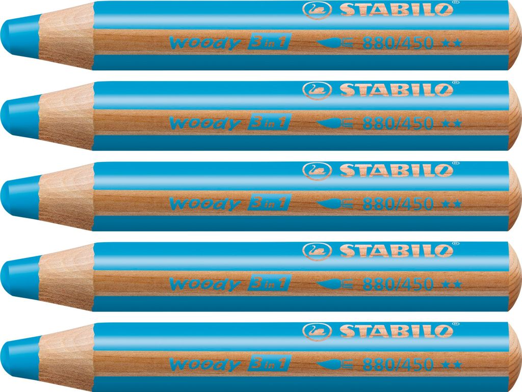 Buntstift, Wasserfarbe & Wachsmalkreide - STABILO woody 3 in 1 - 5er Pack - cyanblau