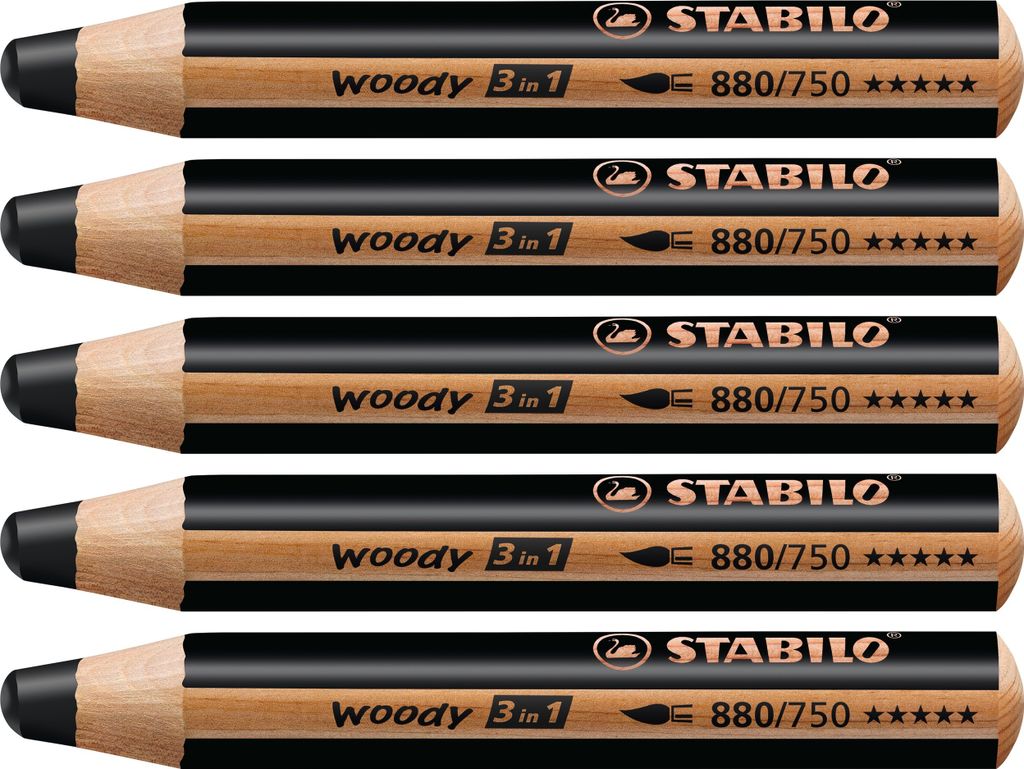 Buntstift, Wasserfarbe & Wachsmalkreide - STABILO woody 3 in 1 - 5er Pack - schwarz