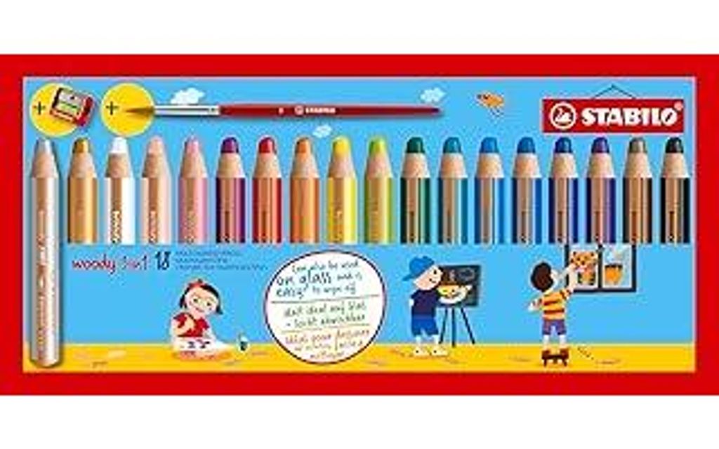 Buntstift, Wasserfarbe & Wachsmalkreide - STABILO woody 3 in 1 - 18er Pack mit Spitzer und Pinsel - mit 18 verschiedenen Farben