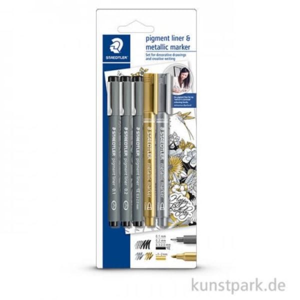 STAEDTLER Fineliner pigment liner 308 + 2 metallic pen, 5er Set