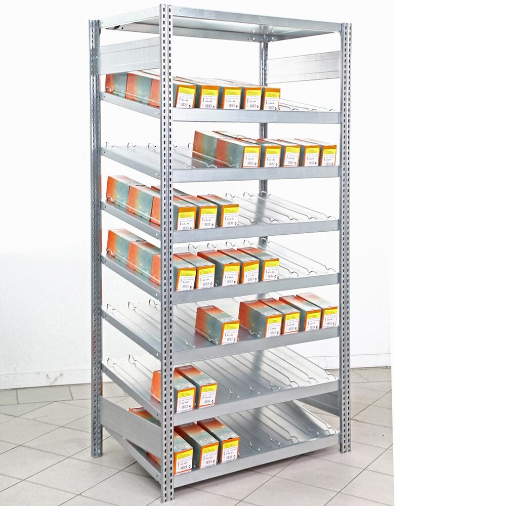 Kanbanregal einseitig FALKE Stecksystem | Grundregal | HxBxT 200x101x60cm | 7x Schrägboden Ebenen, 1x Deckel Stahlfachboden | Fachlast 250kg | Ver...