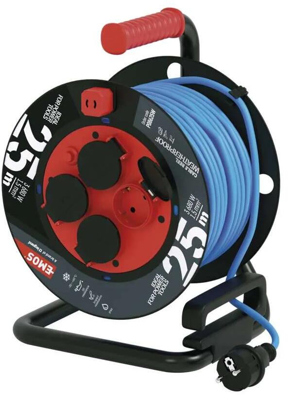 EMOS P08625W Kabeltrommel, wetterfest, 4 Steckdosen, Länge 25m, 1,5mm², PVC, blau (1928742500)