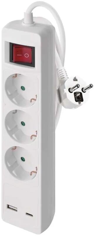 EMOS P1322CU Steckdosenleiste, 3 Steckdosen, 1× USB-A + 1× USB-C , 2m, 1,5mm², roter Schalter, weiß (1922130203)