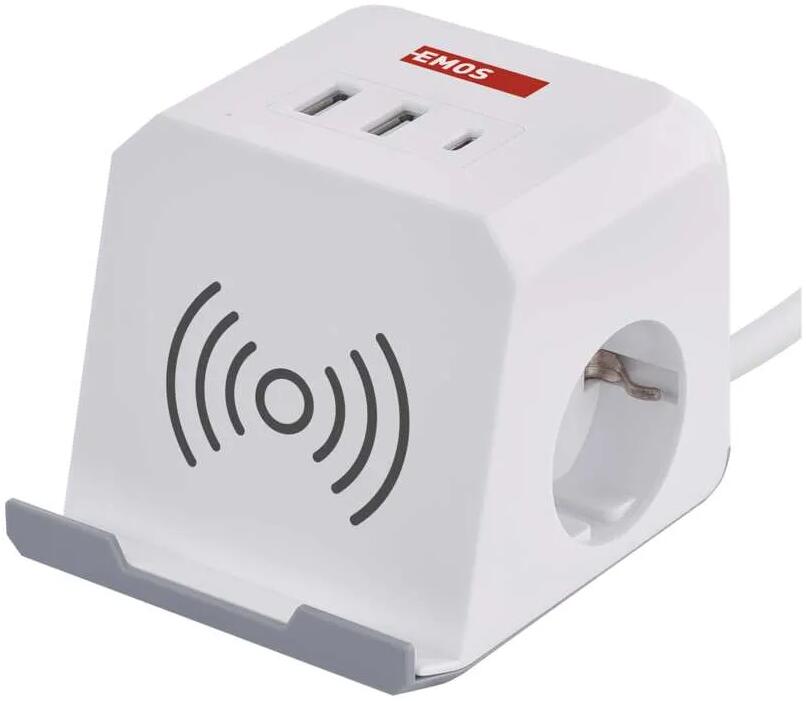 EMOS P0222CQ Steckdosenwürfel, 2 Steckdosen, 2×USB-A+1×USB-C+Qi, 2m, 1,5mm², weiß (1922120200)