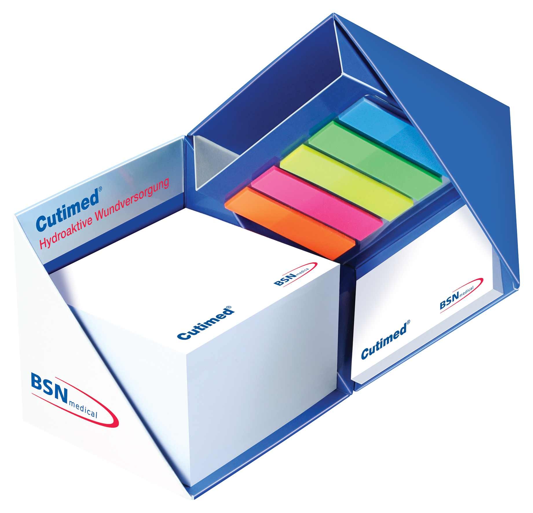 Werbeartikel Notizwürfel mit Stiftehalter 4C-Druck auf Außenseite mit Einzelblattdruck