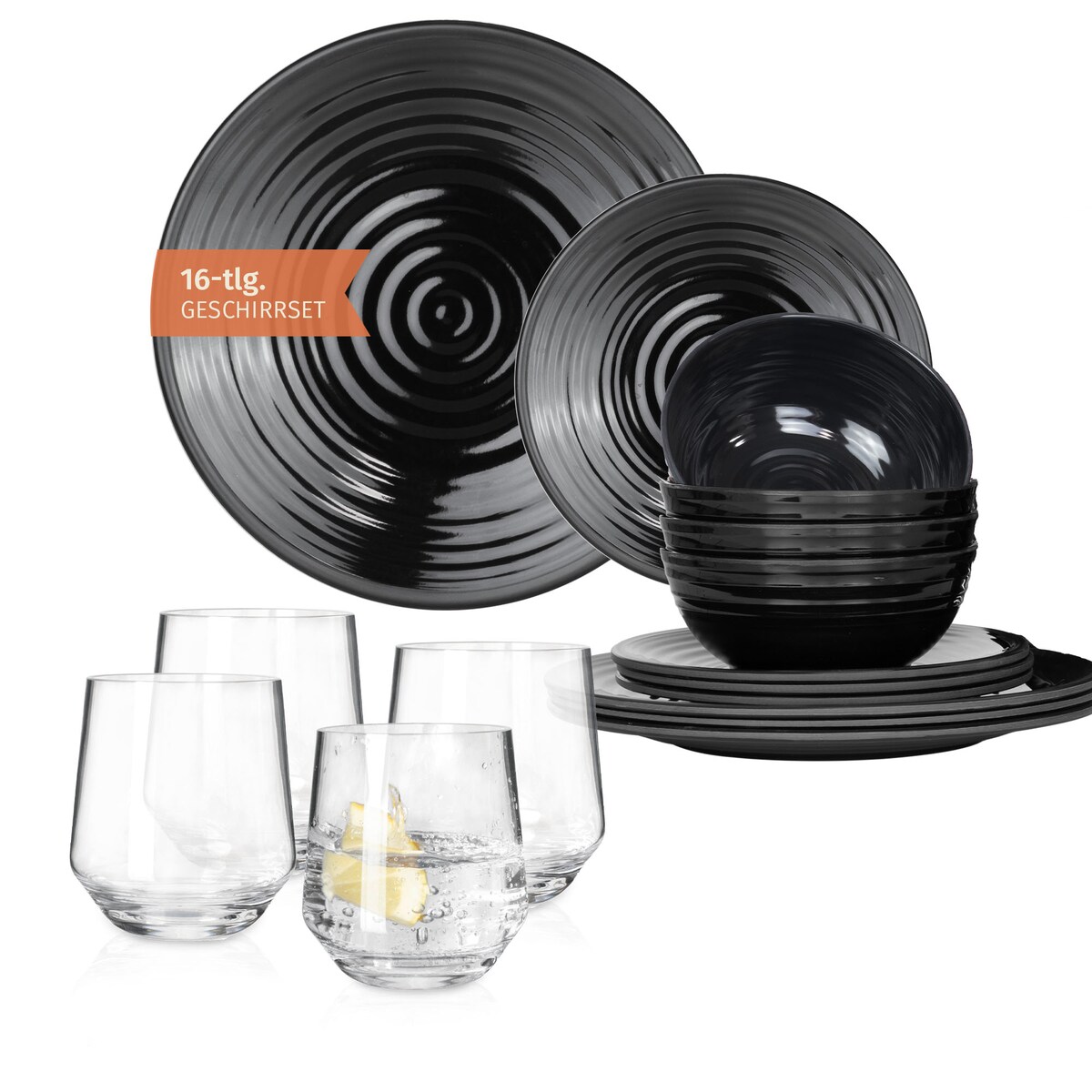 Melamin Camping Geschirr Set 4 Personen Stone Dark Black + 4 Milano Gläser Wassergläser Tafelgeschirr Picknick BBQ Kochgeschirr