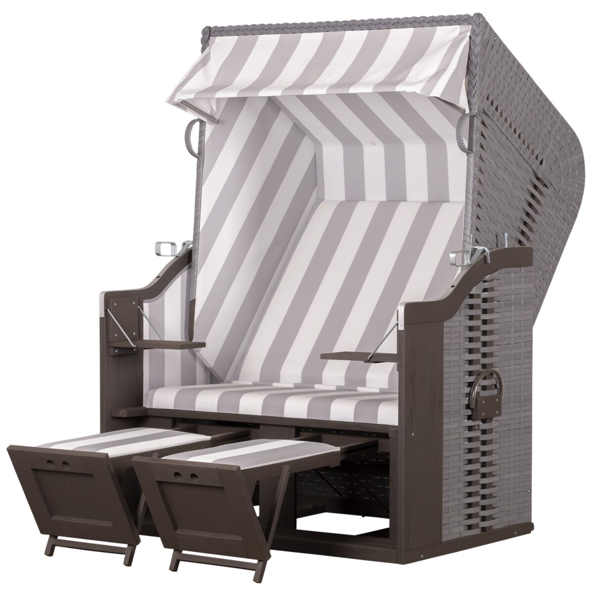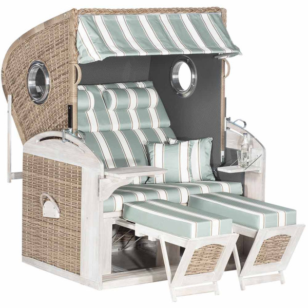 Strandkorb Fehmarn, grau weiß gestreifte Polster, mit Rattengewebe, verstellbaren Kopf/Fußstützen,