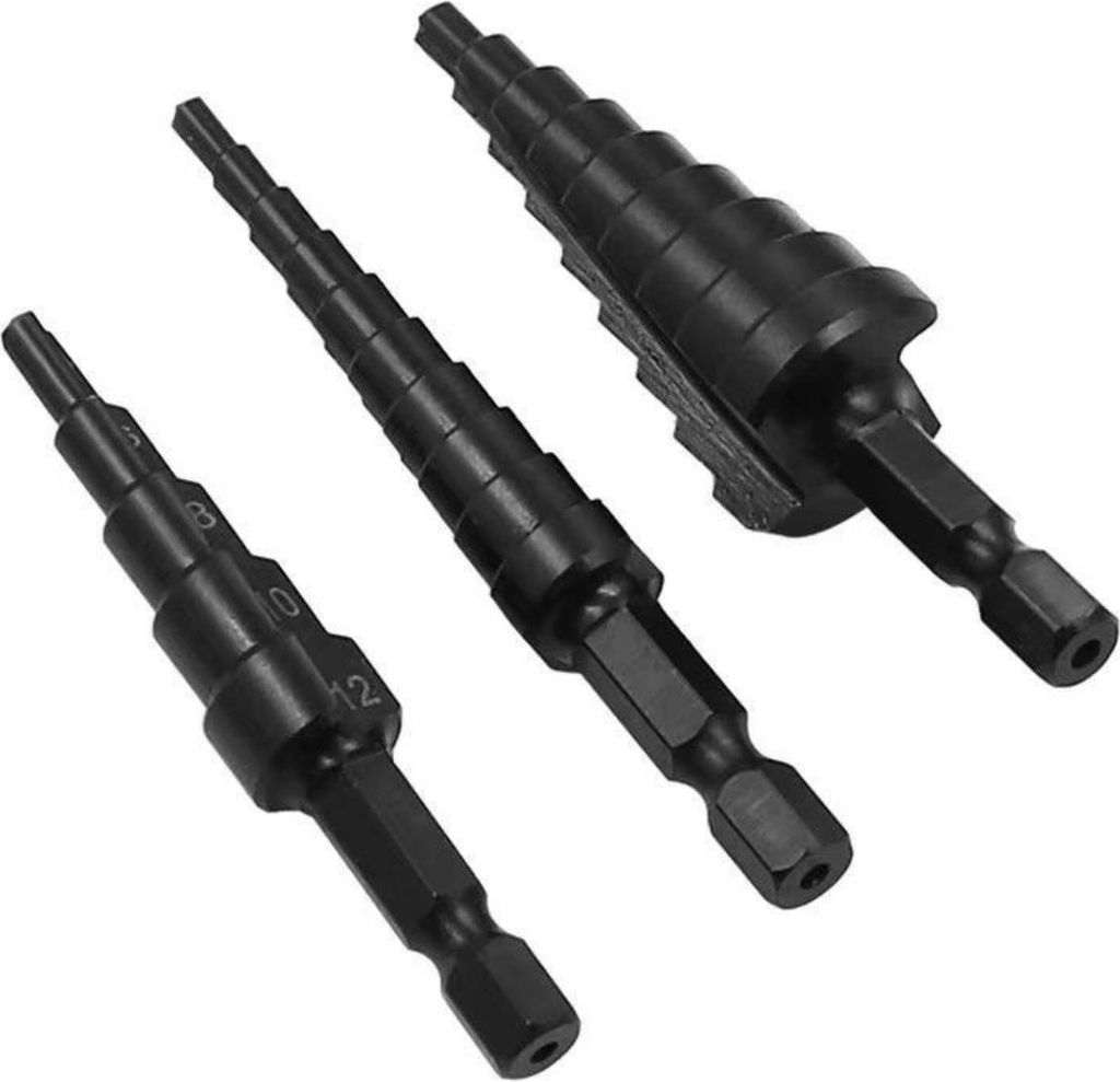 3-teiliges Spiral-Stufenbohrer-Set, HSS-Sechskantschaft, 4 Schneiden, für Metall, Aluminium, Holz und Kunststoff, 1/8-1/2, 1/4-3/4, 3/16-7/8 Zoll